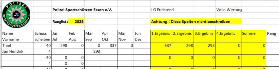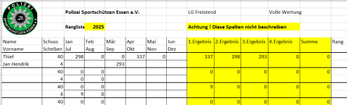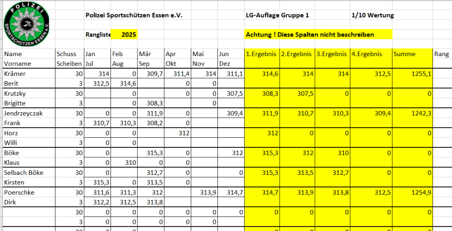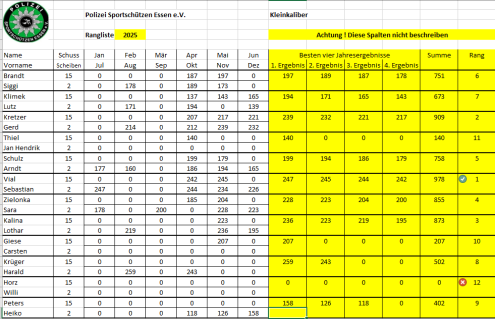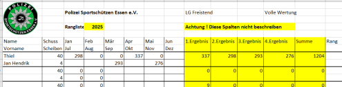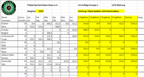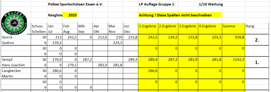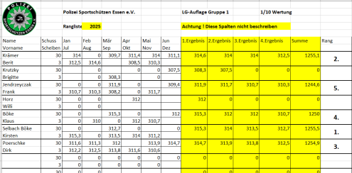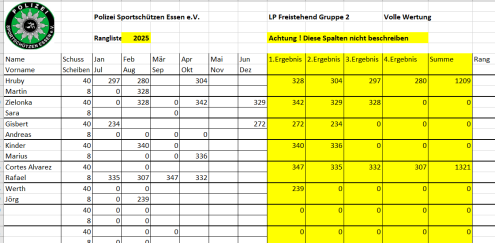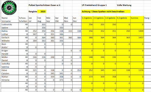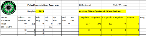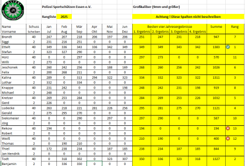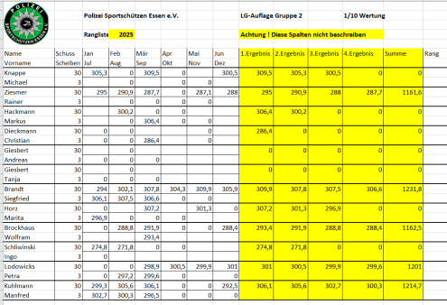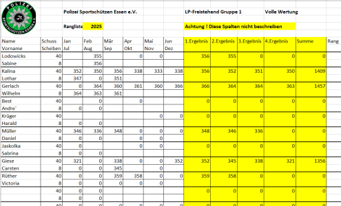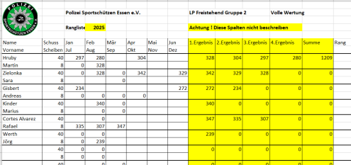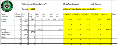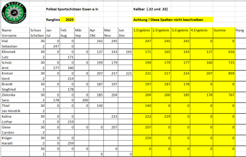 Ab April 2025 wird die vereinsinterne Rangliste immer am 2. Mittwoch des Monats in Borbeck ab 18:00 Uhr geschossen.
